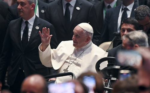 A pápa kerekesszék nélkül, botra támaszkodva lépett be a terembe.